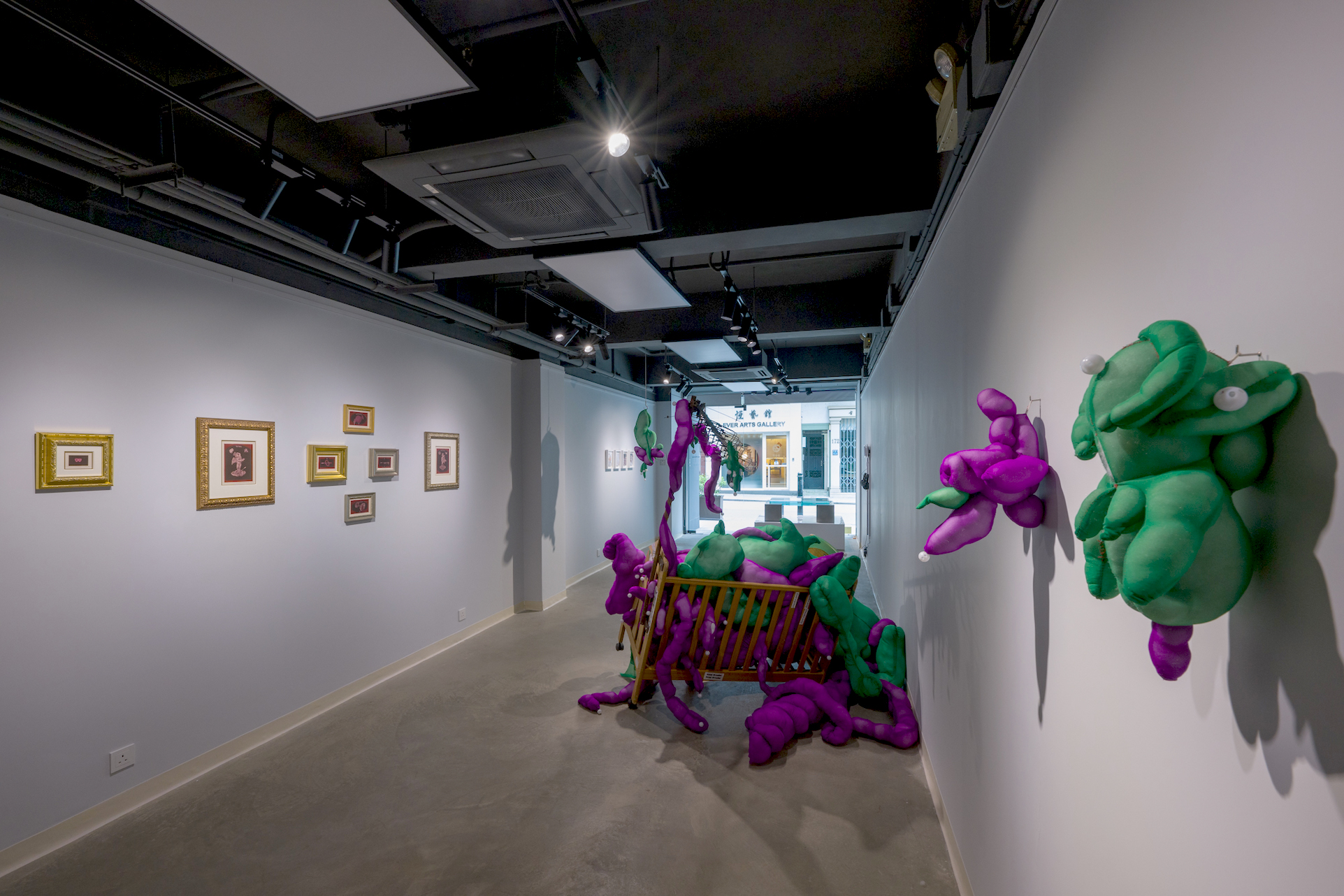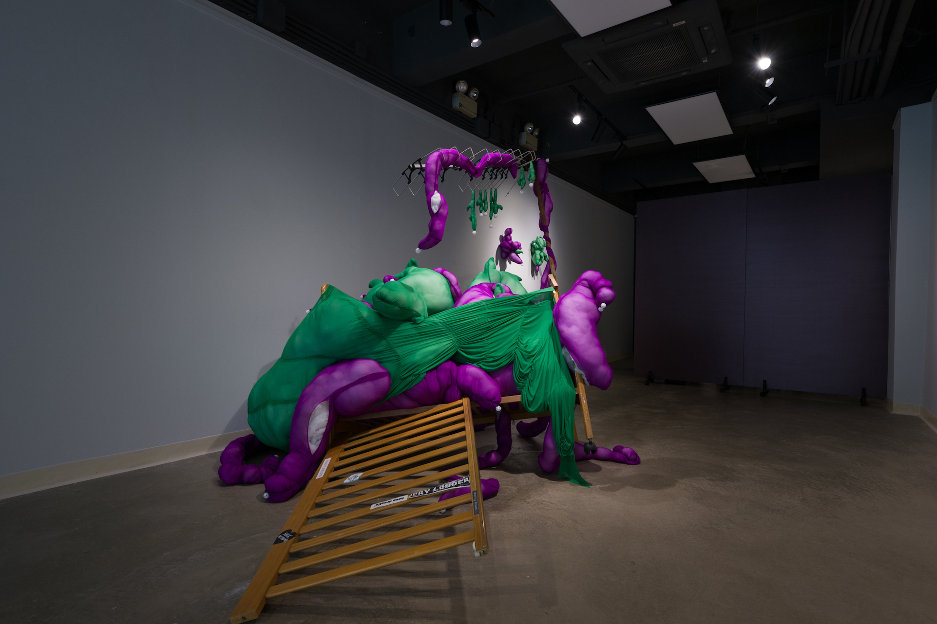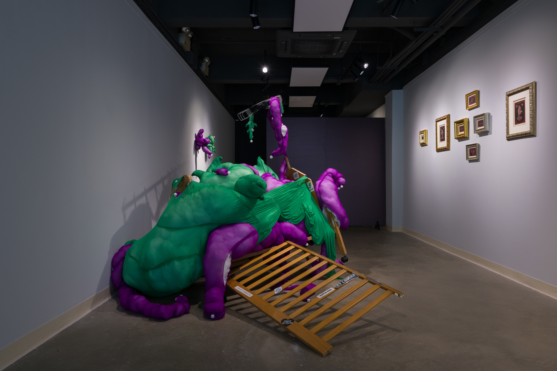 轉向另一個性與權力的領域,陳子雯在《乖乖、同牀、抱抱》中,創造了一個性愛場景,讓觀眾解讀和激發自己內心的 幻想。當我們走近,首先看到兩個生物透過激烈的性愛而摧毀了嬰兒床,並將破碎的床欄拋向我們。嬰兒床的設定,為 這場性行為帶來了一種禁忌感。陳子雯故意模糊這紫色和綠色生物的性徵,以留下詮釋空間,它們中任意一個可以是男 性、女性、無性別抑或是非人類。人物的角色也沒有具體說明,可能涉及亂倫等禁忌。眼前唯一肯定的是,他們正全身 心投入於性愛之中,綠色身體纏繞著紫色的,有如把對方吞噬進懷內,而紫色的身體推擠著綠色的,以至他們都從嬰兒 床上冒出,揮舞著他們的臟器或性器官。從他們的性行為看來,他們好像非常渴望與對方融為一體,以至於這點空間不 夠用,要冒出來侵佔周圍的環境。