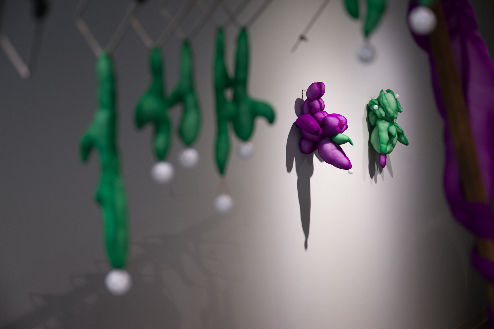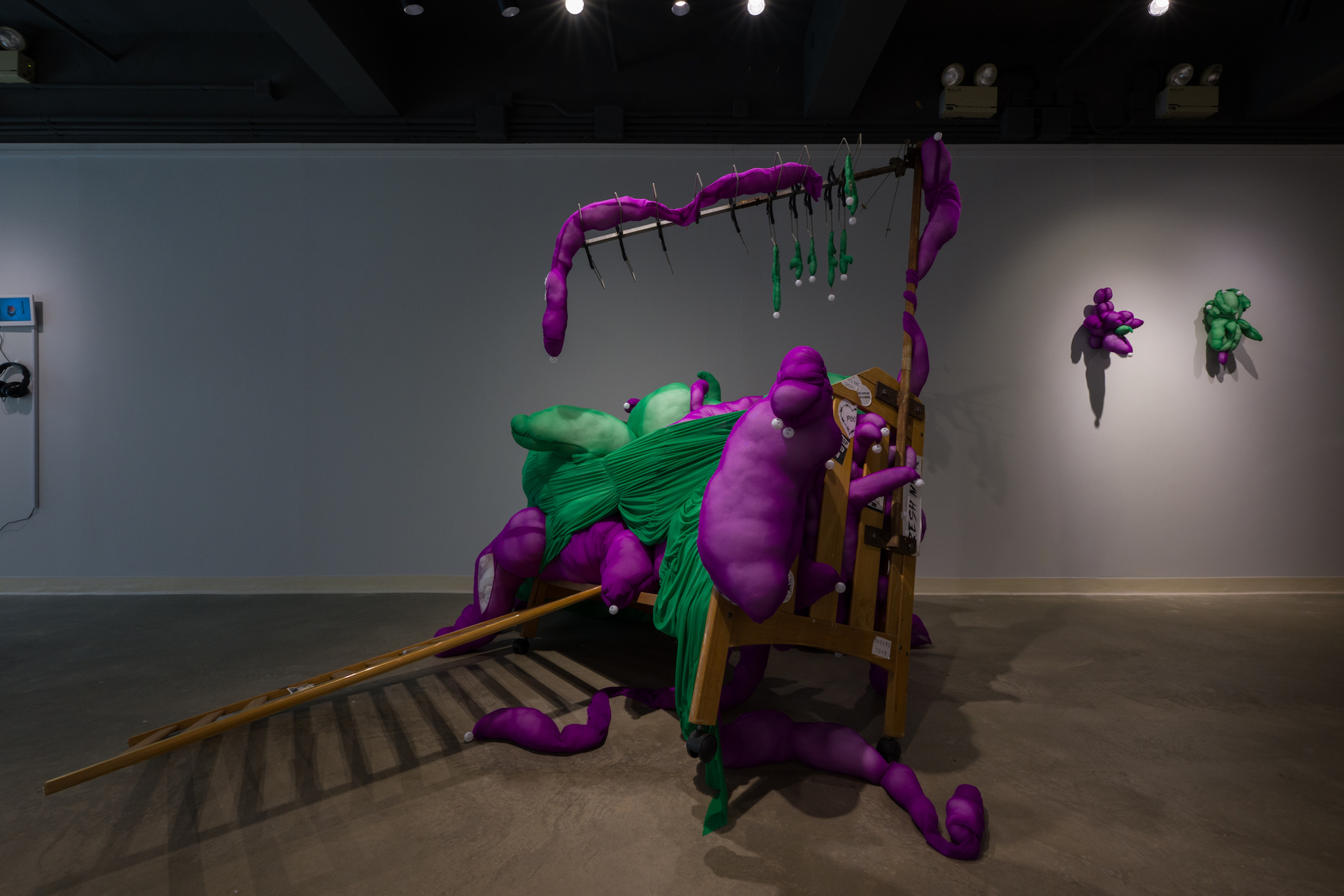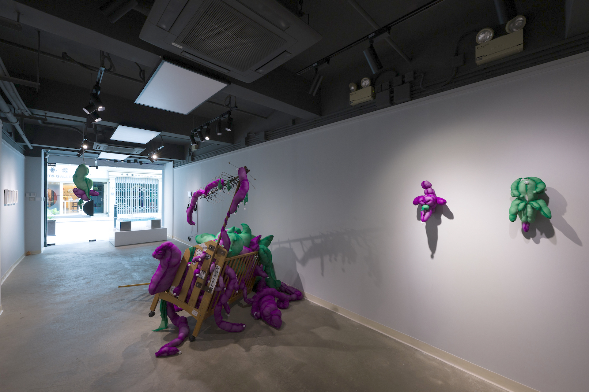 轉向另一個性與權力的領域,陳子雯在《乖乖、同牀、抱抱》中,創造了一個性愛場景,讓觀眾解讀和激發自己內心的 幻想。當我們走近,首先看到兩個生物透過激烈的性愛而摧毀了嬰兒床,並將破碎的床欄拋向我們。嬰兒床的設定,為 這場性行為帶來了一種禁忌感。陳子雯故意模糊這紫色和綠色生物的性徵,以留下詮釋空間,它們中任意一個可以是男 性、女性、無性別抑或是非人類。人物的角色也沒有具體說明,可能涉及亂倫等禁忌。眼前唯一肯定的是,他們正全身 心投入於性愛之中,綠色身體纏繞著紫色的,有如把對方吞噬進懷內,而紫色的身體推擠著綠色的,以至他們都從嬰兒 床上冒出,揮舞著他們的臟器或性器官。從他們的性行為看來,他們好像非常渴望與對方融為一體,以至於這點空間不 夠用,要冒出來侵佔周圍的環境。
