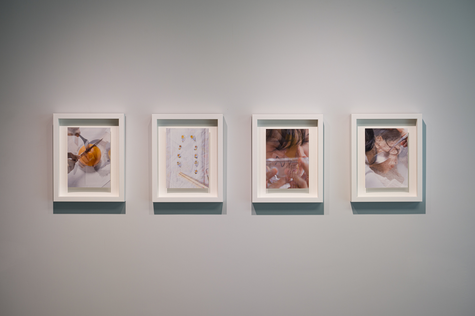 All four videos feature Florence performing a series of actions on a traditional white tablecloth setting which directly references the act of eating and recalls Adams’ parallel drawn between meat eating and patriarchal power. Florence involves her own body in all four ‘tabletop action poetries.’ The actions stem from her own experience of male/female power dynamics and female fertility through the lens of The Sexual Politics of Meat. In Chicken, Florence places an orange on top of her baby photo on the table. She then proceeds to cut the orange open with a steak knife, echoing the action of cutting meat into bite-sized pieces before consumption. The orange seeds are picked out and set aside while she squeezes orange juice into the glass. She then proceeds to drink the seed with the orange juice as if she were taking medicine. Instead of a thermometer, a pregnancy test is used to ‘take her temperature.’ The metaphor for female fertility is clear, as female fertility in the form of the orange and the orange seed is harvested and the state of fertility is compared to being sick. Pork features Florence singling out Queens from shuffling decks of playing cards, cutting out the flowers, placing the resultant 14 flowers in two rows with chopsticks on a period pad, and spitting on the flowers with chocolate milk that she drank from a glass. There is a direct reference to the animal in question as female pigs have 14 nipples, and the symbols of female fertility are sprinkled throughout: the flowers, the Queen symbolizing the female, the period pad which alludes to menstruation, an indication of female fertility. The actions in Beef invite multiple layered readings. Florence takes an eyeliner that has been set on a plate and draws ‘NO’ on her face. She then takes soap out of her bra to grate it and collects the grated soap on a metal dish. After this she takes an onion out of her bra, peels the skin and proceeds grating it to make herself tear up. She collects the tears in a glass bowl, mixes the tears with the grated soap and uses the resulting soap water to clean ‘NO’ from her face. Before abortion was legalised, one folk method was to grate soap, mix it with boiling hot water and inject into the uterus. The tears can be read as a sign of emotion, or non-emotion as just a bodily reaction. The ‘NO ’offers many possible readings. Is the ‘NO’ a no to patriarchal power and thus a reclaiming of female agency and sexual power? Is it a symbol of the negations, denials, and rejections, the ‘NO’ branded on the female body by patriarchal society? Is it the artist saying ‘NO’ to the audience’s consumption of her? The possibilities go on. In Fish, Florence ties a few strands of hair to a fishing hook, hooks a pair of nude lace underwear with the tablecloth, puts a spoon through the hair ‘fishing line’ into her mouth and proceeds to pull the underwear and tablecloth up with the spoon. The ‘consumption’ of sex represented by the lace underwear is here linked to the consumption of meat through the act of hunting with the fishing hook. These works comment on the lost sexual power in female fertility which is taken for granted in both the human and animal world.