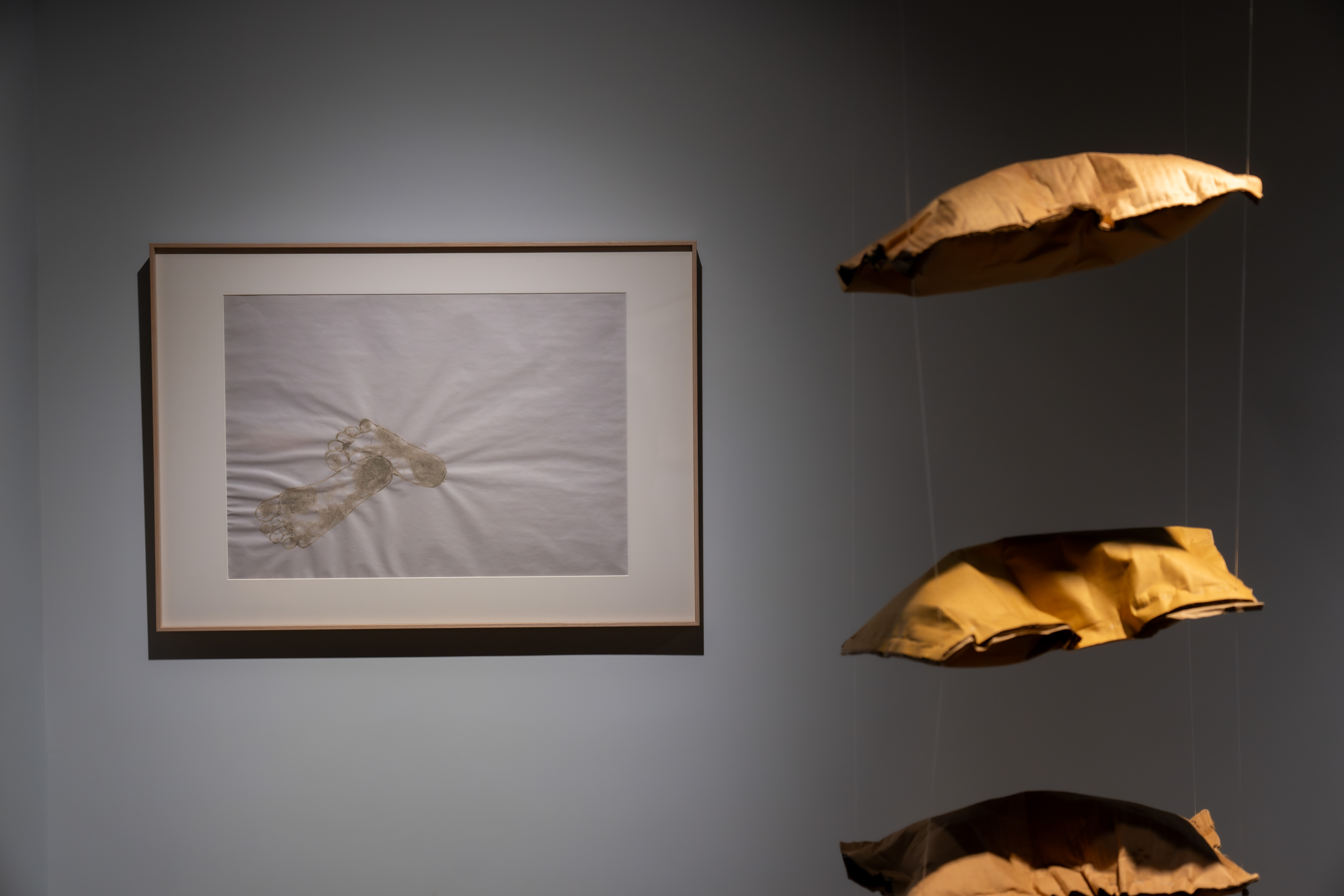 If you have been walking around in Hong Kong, then the gallery façade may look familiar. It has been boarded up to resemble the make-shift wooden and/or cardboard structures that form temporary shelters for the homeless in Kwun Tong Public Pier and elsewhere. Inside the gallery, you encounter a network of nest sculptures hanging from branches (Shelter), a floating installation of cardboard pillow sculptures (So.call Mobility), and feet on paper lining the walls (Cuddle). Each series of works refers to homelessness directly in some way.
