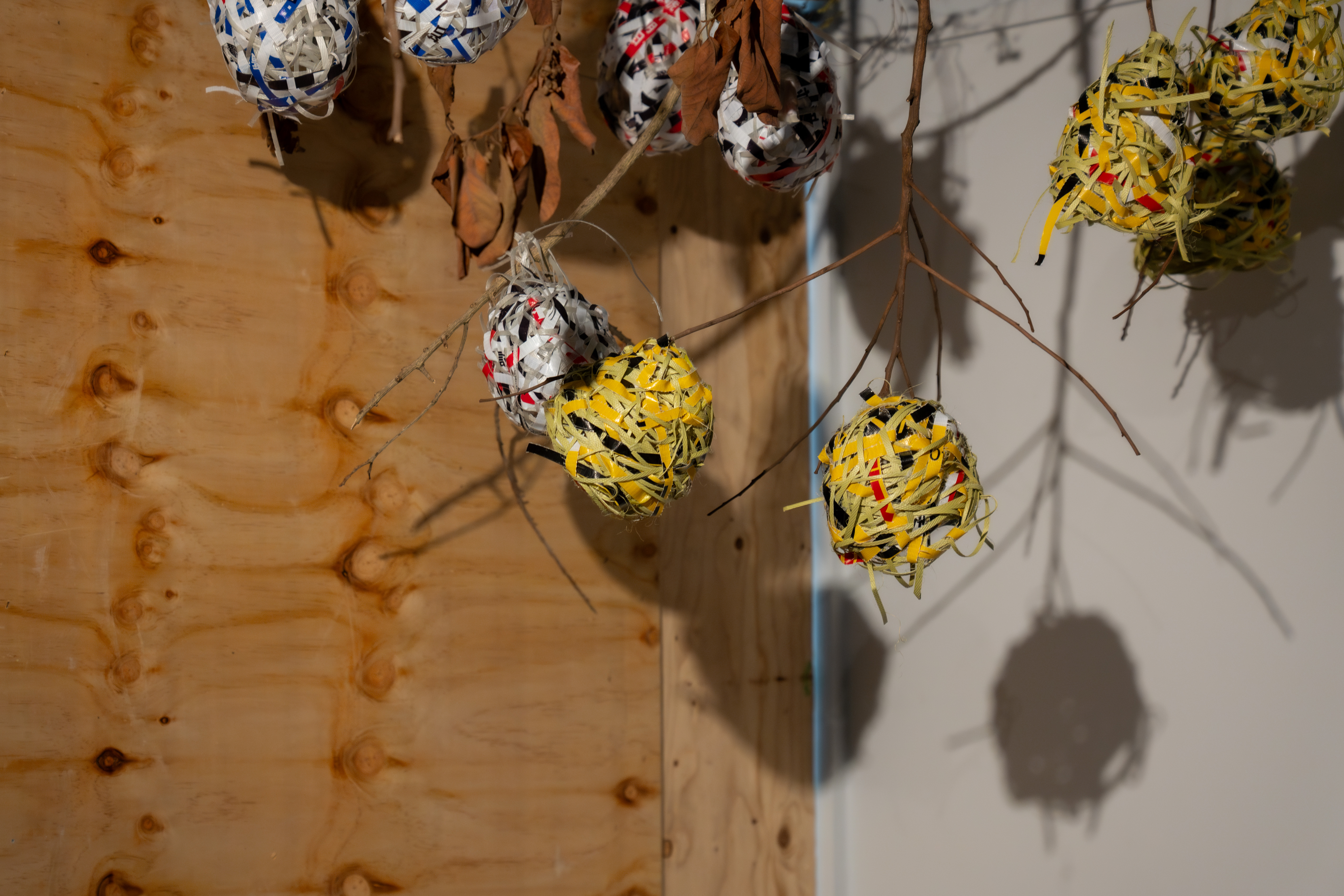 Go Hung used weaver birds’ nests as a reference for ‘Shelter’. When one thinks of shelters in nature, nests are one of the most immediate that come to mind. Birds build nests as their home to build a family and rear their young in, as well as provide safety against the elements and predators. There are many examples of animals in nature building or finding their own homes. There is a homing instinct, a near-universal instinct across vastly different species that seeks for a home which provides if not a sense of belonging, then at least shelter, safety, and security. Yet why is it so difficult for us humans? There are various man-made obstacles blocking us from fulfilling that natural instinct of obtaining a home. In this city, it could be the exorbitant property prices, lack of public housing, and economic impact from recent setbacks (namely damage sustained from the coronavirus pandemic) that demolish an individual’s ability for self-sustenance. If you look closely at the nests, you will see that the shredded vinyl references the many property ads you see posted around the streets of Hong Kong. The different colours, shapes, and sizes of the nest sculptures also refer to the various types of properties one can find in Hong Kong. These are all available ‘empty’ potential homes that are still unclaimed, a distant, nigh unattainable dream to many. A statistical analysis by the Welfare Services of Hong Kong in 2022 notes that the number of registered street sleepers had risen to 1,580 (2020-2021), an approximately 76% rise compared to 896 from 5 years ago (2015 – 2016). The number of services and beds cannot keep up with this soaring demand. The fourteen ‘Shelters’ hanging around the gallery correspond to the total number of temporary shelters recognized by the government for the homeless. These ‘Shelters’ both refer to those temporary homes and the dreams of obtaining a home.