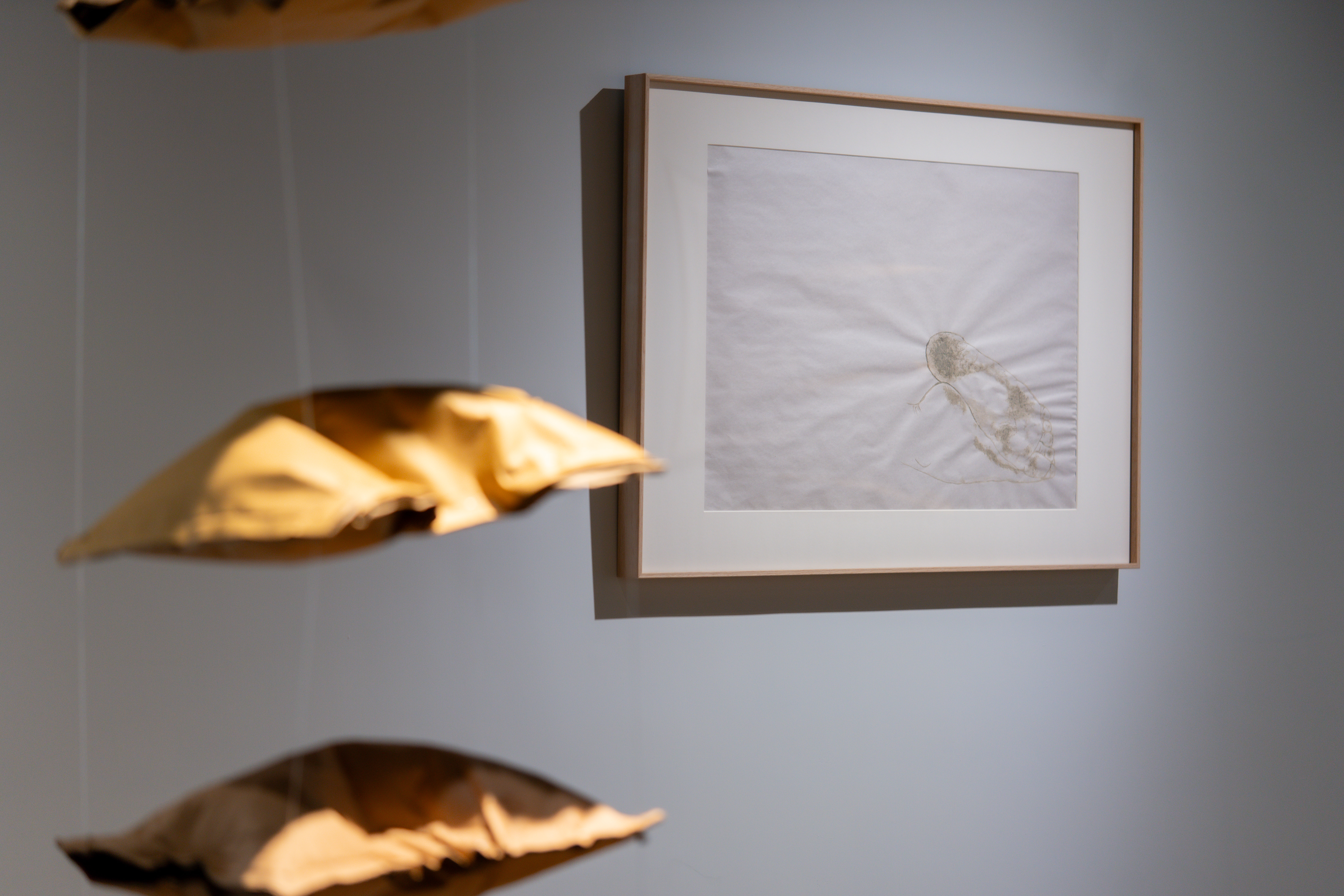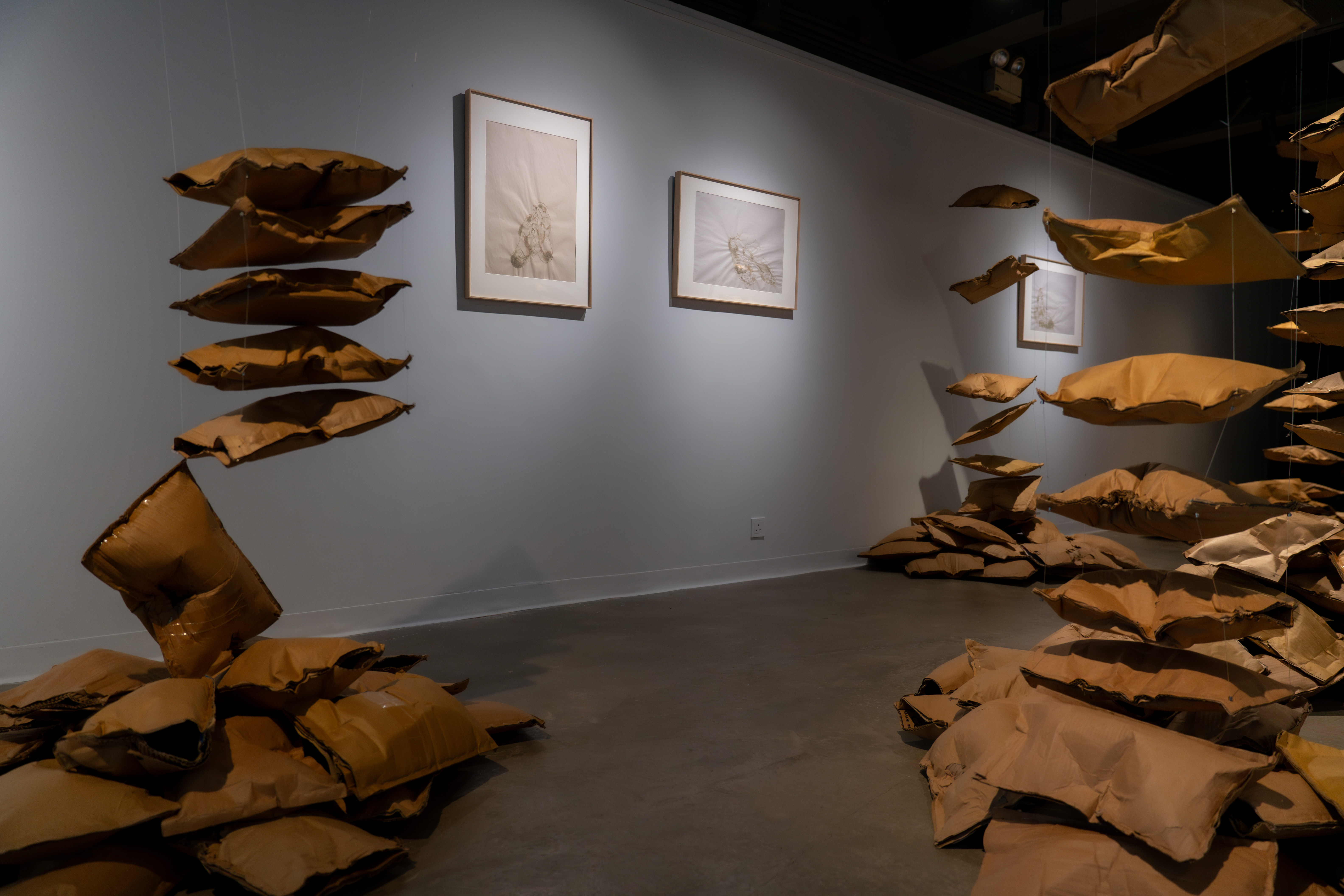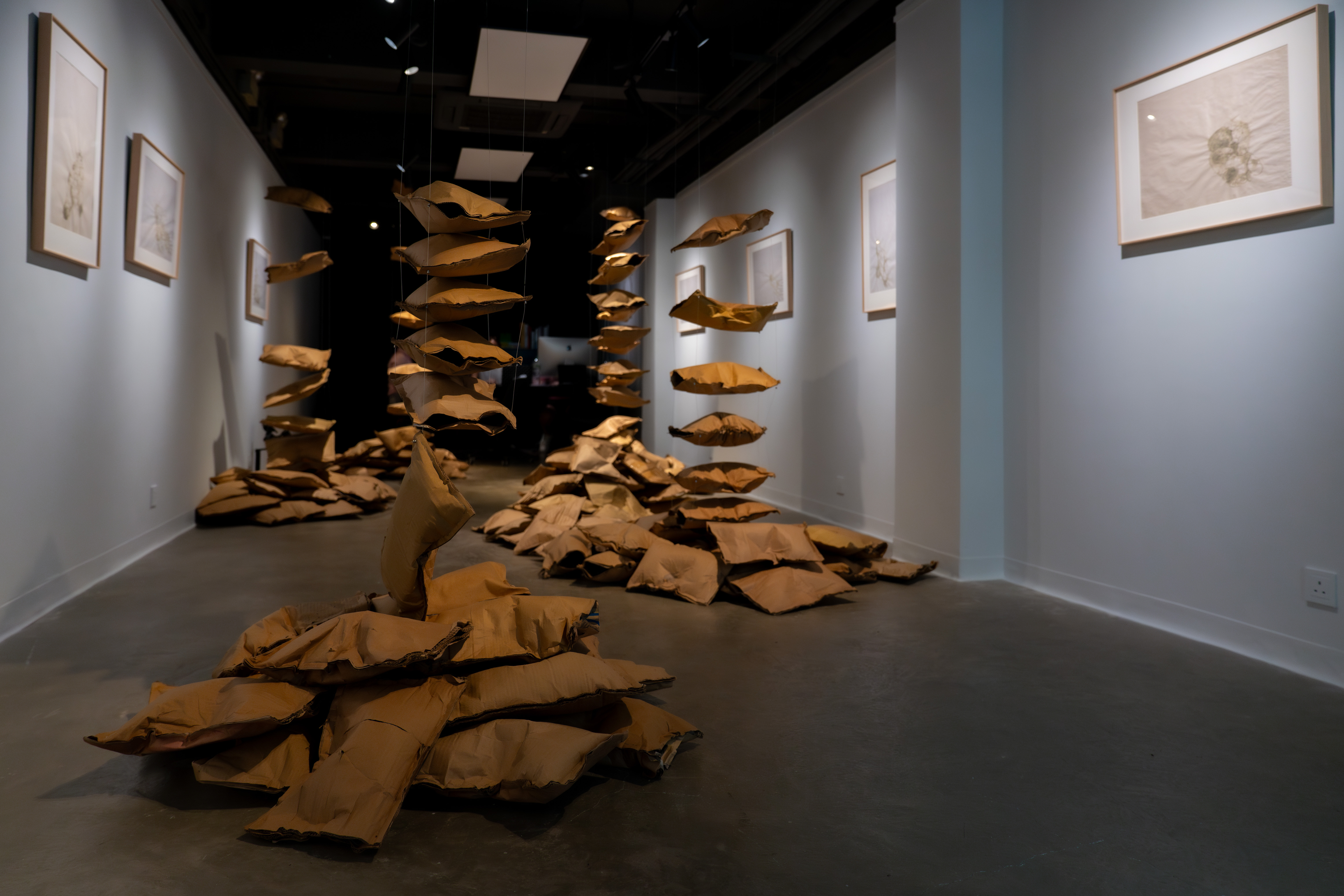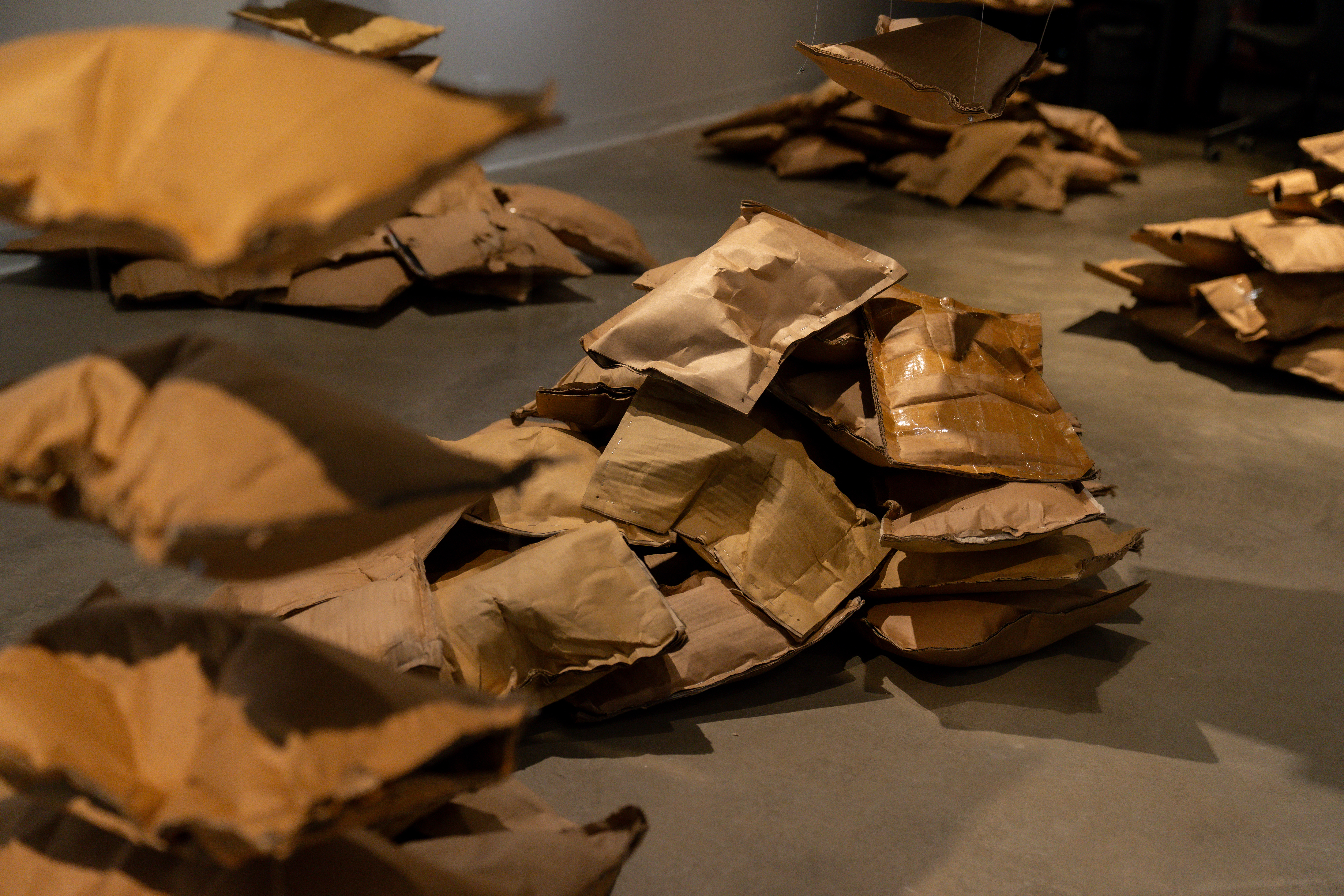 如果您曾在香港街頭漫步,那麼畫廊的外觀可能看起來似曾相識。它已被木板封住,類似於觀塘公共 碼頭和其他地方為無家可歸者搭建的臨時木屋和/或紙板結構的庇護所。在畫廊內,您會看到懸掛在 樹枝上的鳥巢雕塑群(Shelter)、漂浮著的紙板枕頭雕塑裝置(So.call Mobility)以及牆上畫紙中的腳 (Cuddle)。 每一系列作品都以某種方式直接指向無家可歸。