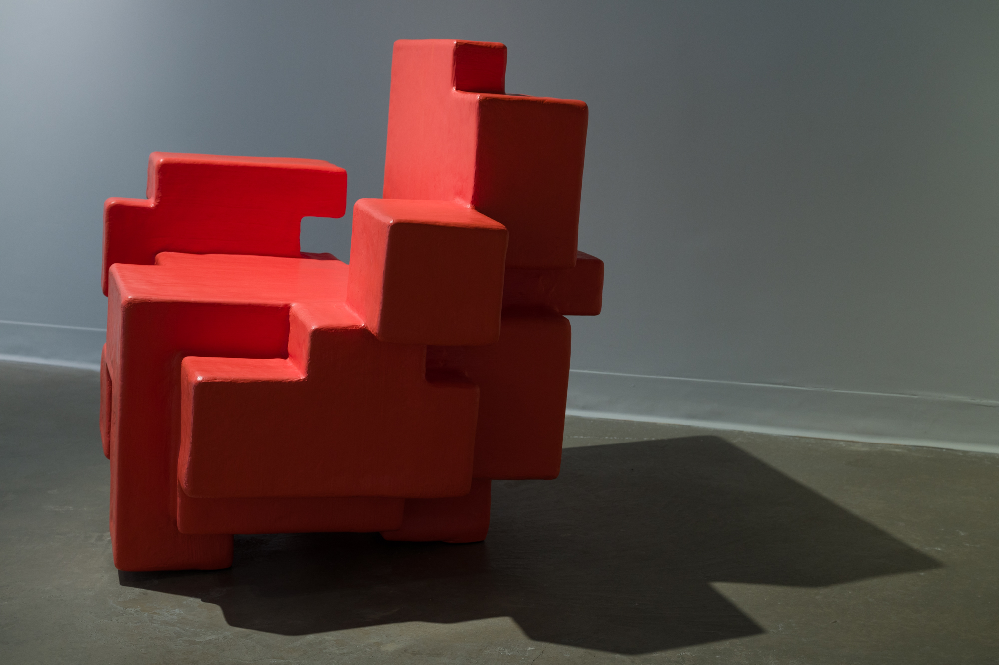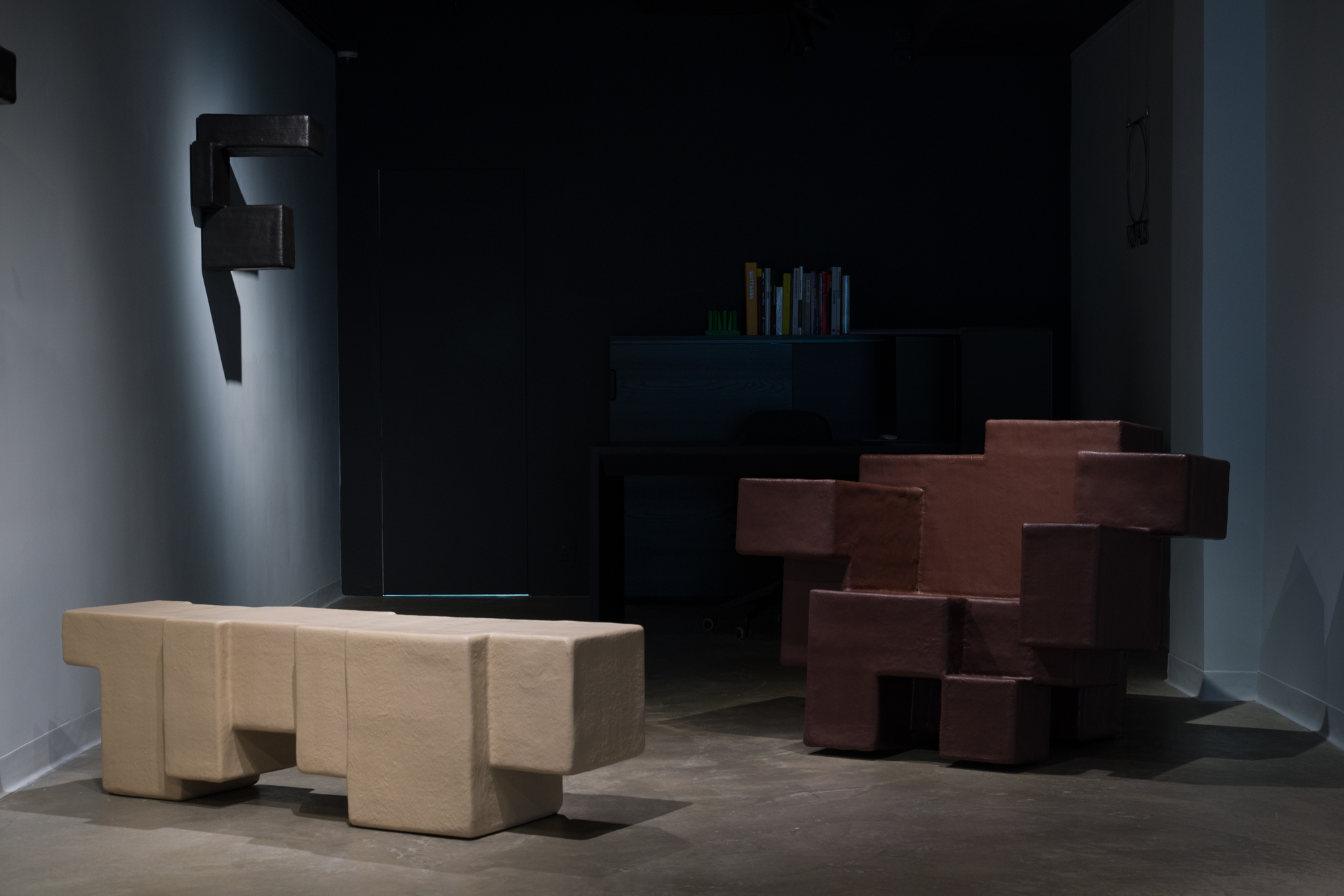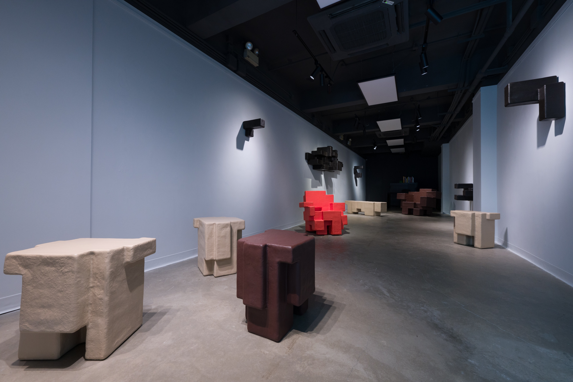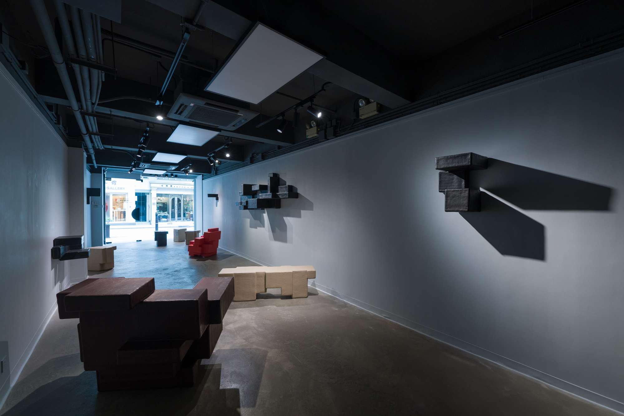 步進香港的 Novalis 藝術設計畫廊,我們便立刻喪失對時間和地點的所有感知,眼前是一組神秘的幾何雕塑元素,它們以強烈的原色——紅色、白色 和黑色呈現,彷彿是從地板和牆直接破壁而出。這些元素令人聯想到卡濟米爾.馬列維奇(Kazimir Malevich)1920 年代的絕對主義(Suprematist)白色單色建築體(Architectones),又或者是羅伯特.莫里斯(Robert Morris)1960年代簡約主義的灰色形態(Gestalts),並透過恍如來自《2001太空漫遊》續集中,充滿未來感的七彩岩石而被重新審視。細看之下,我們意識到自己不是進入了一個非客觀空間(借用馬列維奇的術語),而是看到供人們使用的實用物品,它們都屬於日常生活中可識別的類型:扶手椅、凳子、長椅、書架……這是都是藝術還是設計作品?或許理查德.阿特施瓦格(Richard Artschwager)的分析能為我們解答:「如果你坐在上面,它就是椅子;如果你圍著它走並觀察它,它就是雕塑……視覺性和物體性可以同時存在而互不矛盾。」(2)