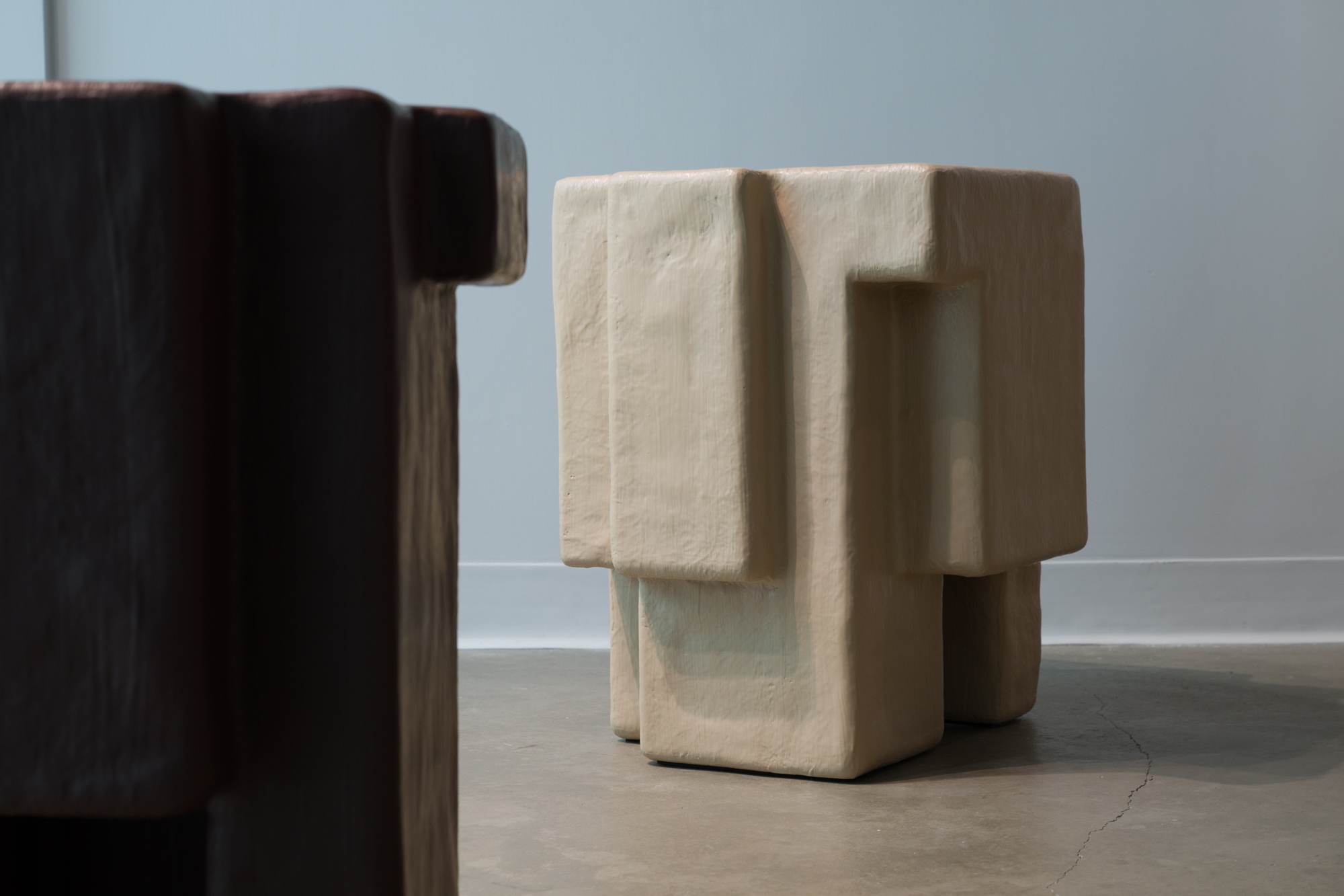 Primitive is ultimately a slap in the face to industrial design. Nucleo uses materials from the industrial design world in an unexpected and provocative manner: cardboard, traditionally used to create a model or early prototype, here becomes the structure’s skeleton. An assemblage of building block-like boxes out of cardboard are solidified through fiberglass and the application of resin along the surface – a painstaking and uneconomically long and complicated process for a material which is usually molded. Needless to say, the automobile technician in Turin who taught Studio Nucleo how to mold resin was scandalized by such irreverence! (10) Resin has become their signature material, with its transformative and almost alchemistic- like properties. “Resin is incredible because it is more than one material, (it) could be transparent, matt, flexible, soft, rigid, colored, nuanced, opaline, strong, weak, liquid, solid (…)”, according to Piergiorgio Robino: “Using resin means working without any borders. Making the impossible, possible.” (11) Each resulting furniture object or functional sculpture is unique, its individuality and imperfections – like a deeply ingrained memory – are revealed beneath the translucid, skin-like surface.