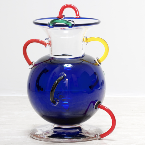 Vase in clear and blue blown glass with multi-coloured handles