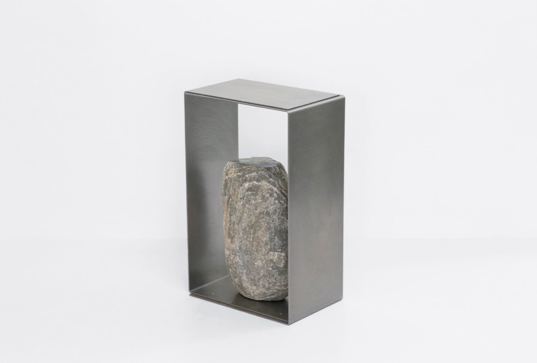 Batten and Kamp Steel and Stone Side Table, 2020 Collection: Shelter to Ground Hand brushed stainless steel, granite. Signed. Each is unique. L 35, W 23, H 55 cm Limited edition of 24