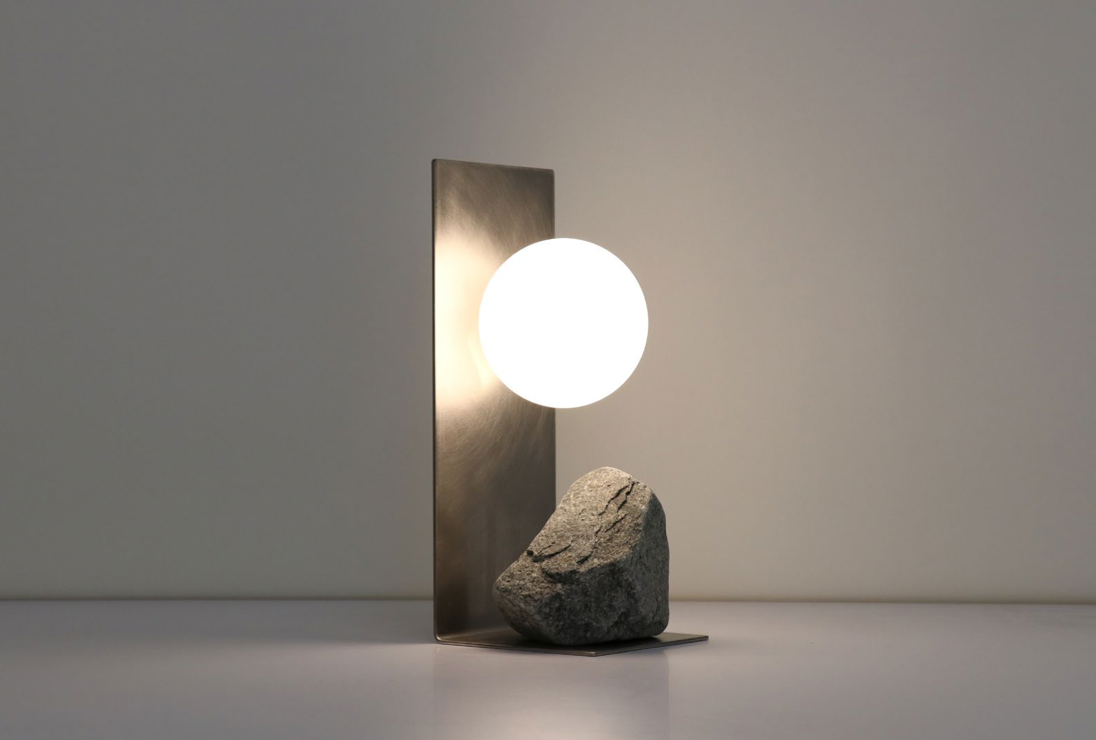 Hand brushed brass, natural stone, tinted glass, LED, electrical components.