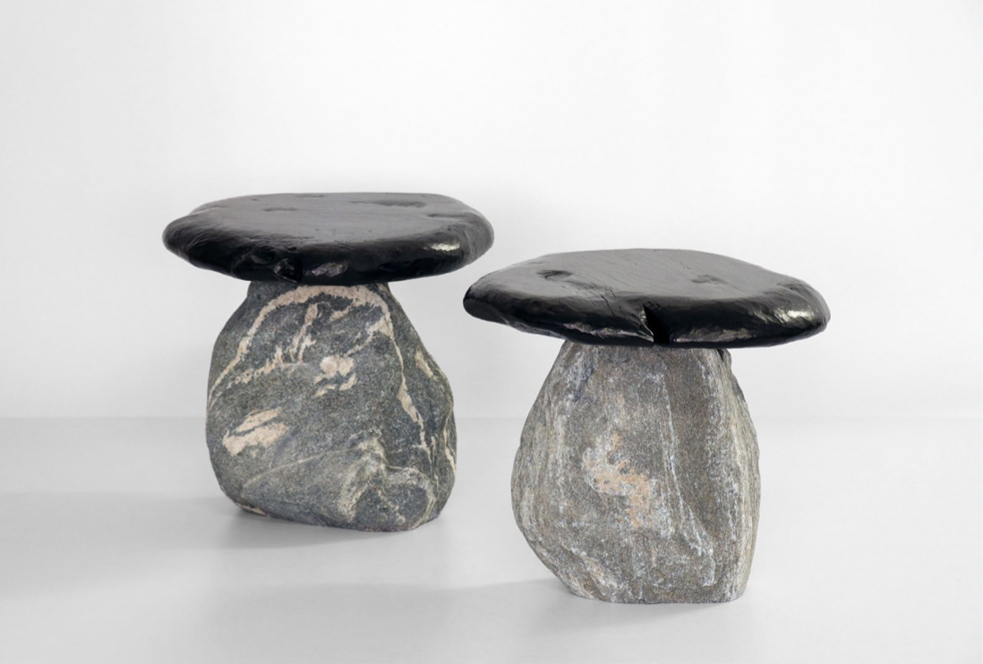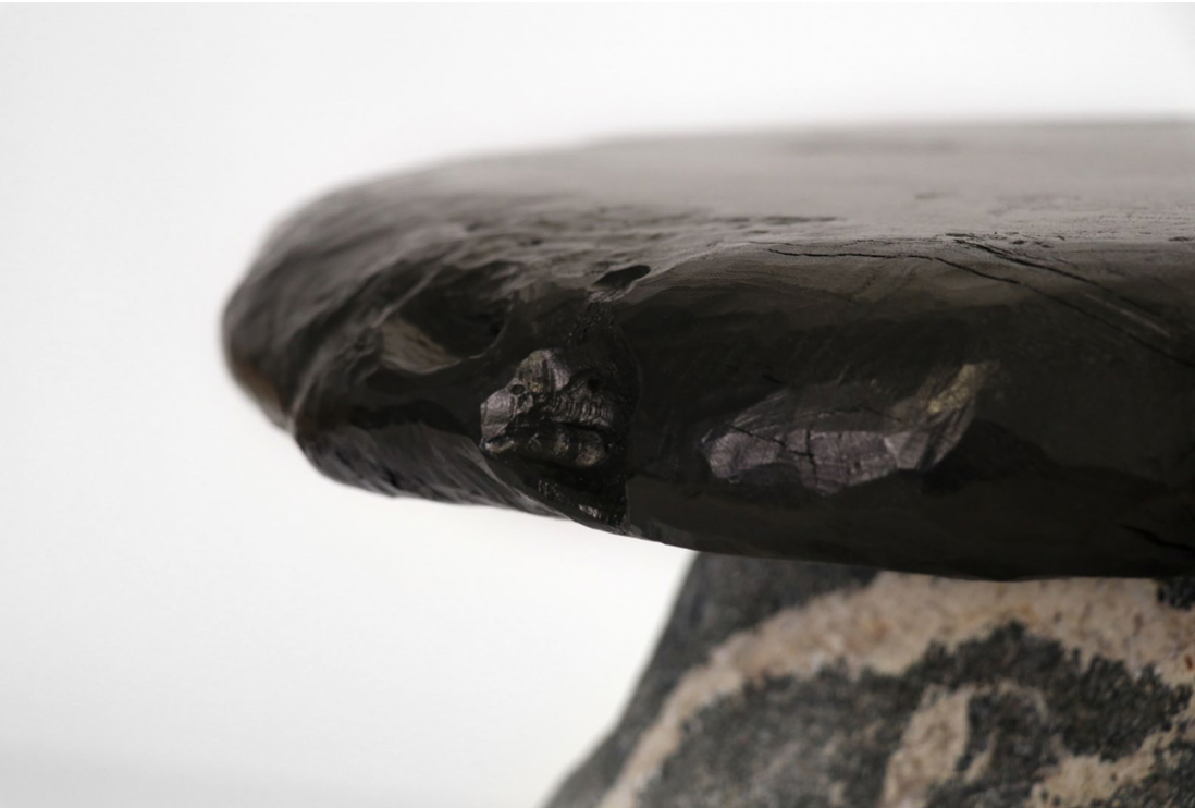 Batten and Kamp Untitled, 2021 Collection: Henry D’Ath x Batten and Kamp Hand carved solid wood, natural stone, calligraphy ink. Stool/side table. Signed. Each is unique. D 40 x H 43 cm Limited edition of 24