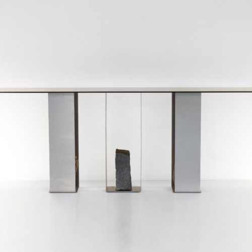 Batten and Kamp Steel and Stone Console Table 01, 2020 Collection: Shelter to Ground Hand brushed stainless steel, tinted glass, granite. Signed. Each is unique. L 190,W 50, H 73 cm Limited edition of 24