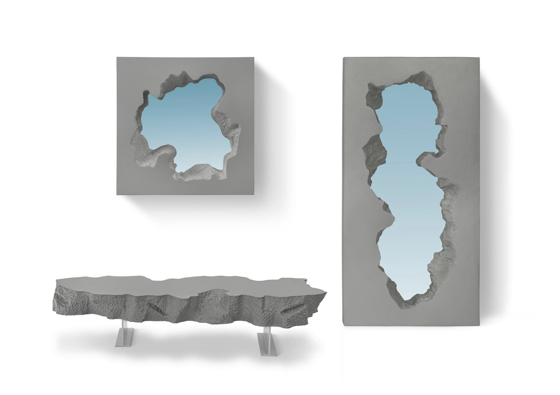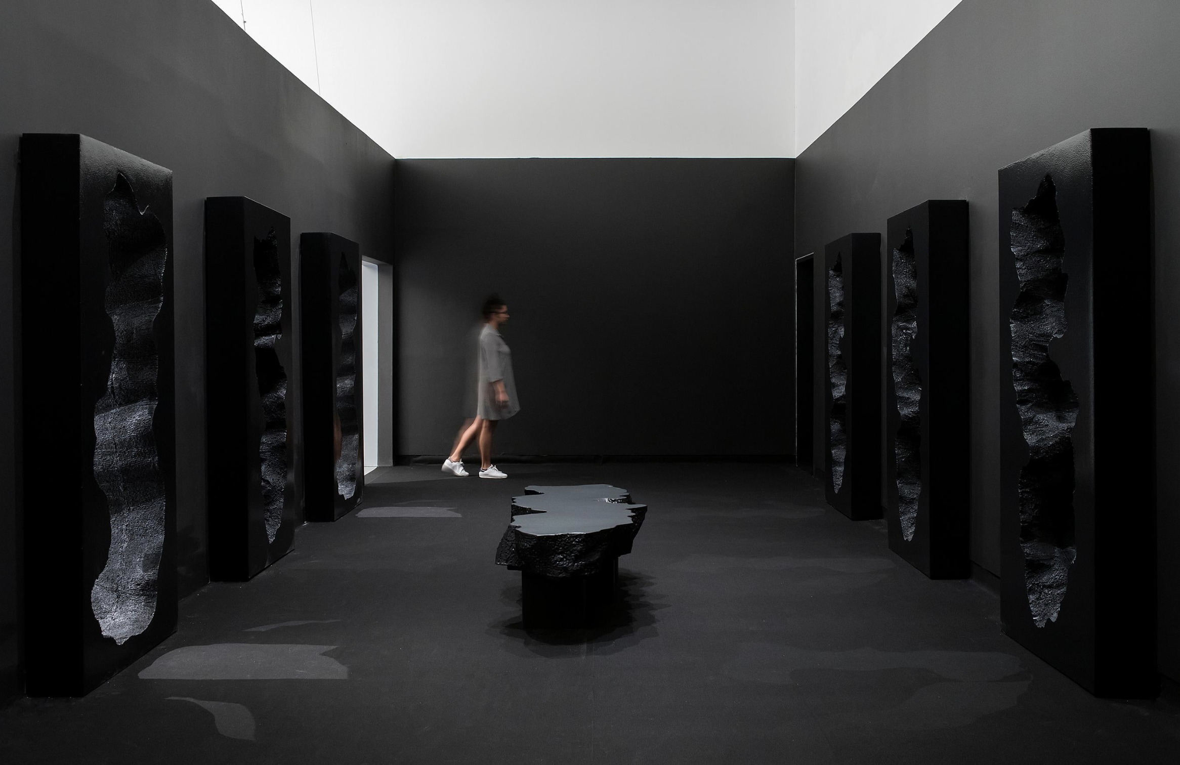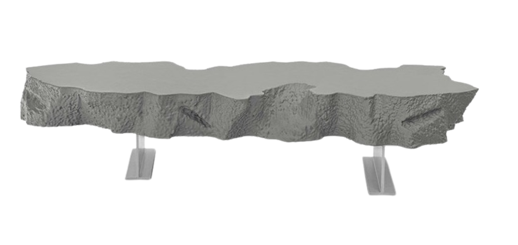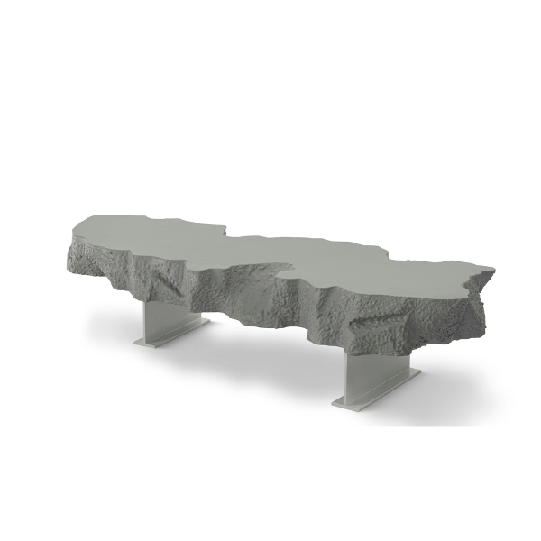 Snarkitecture Broken Bench, 2020 Irregular slab in soft polyurethane hand finished with Guflac®, supported by beams in a highly resistant plastic agglomerate. L190 x W70 x H43 cm