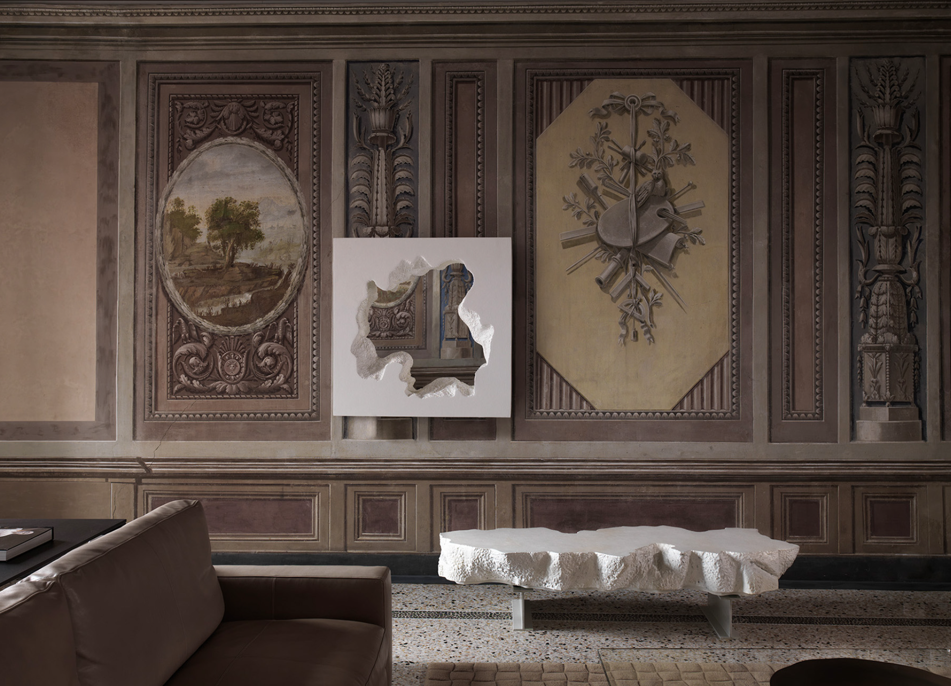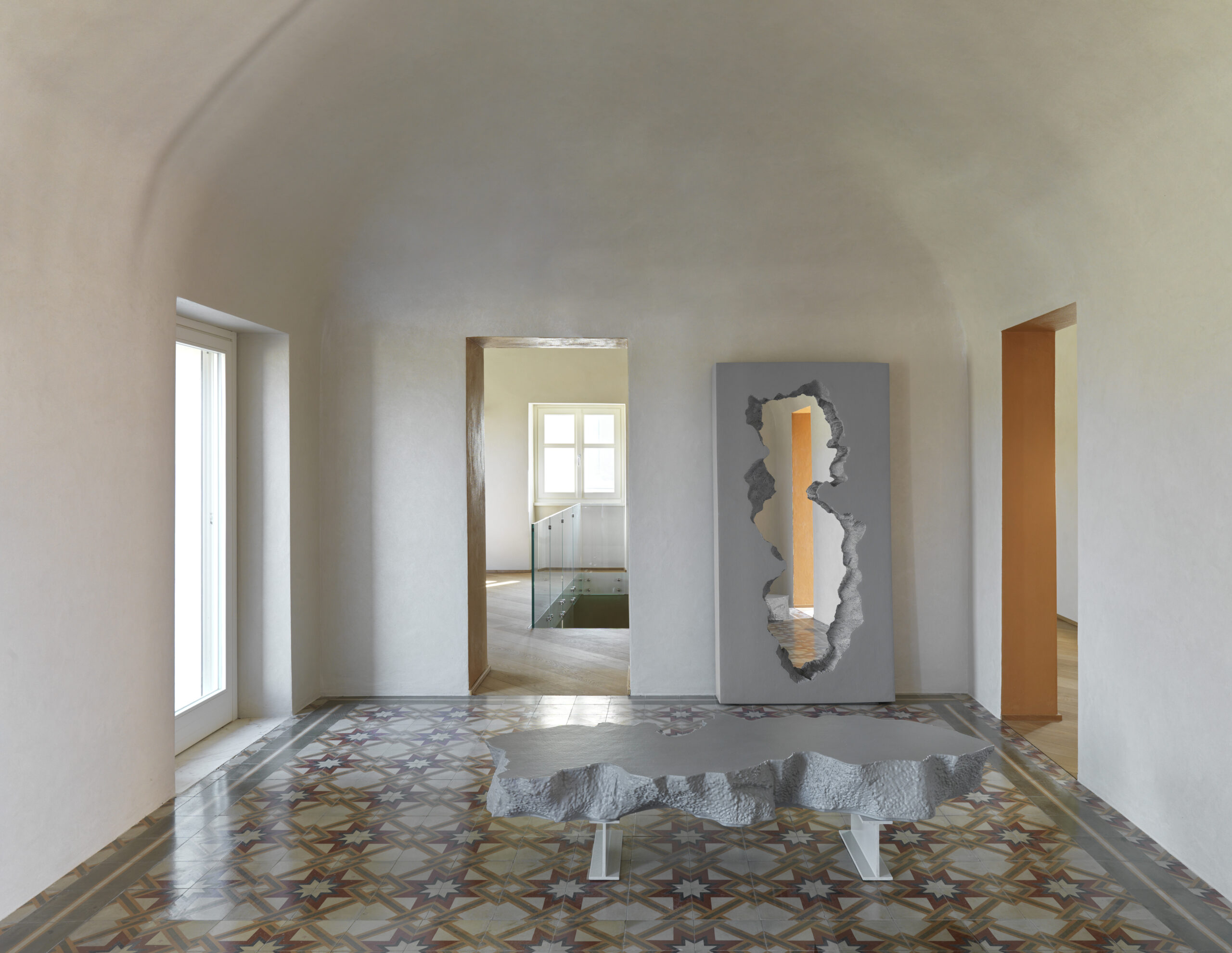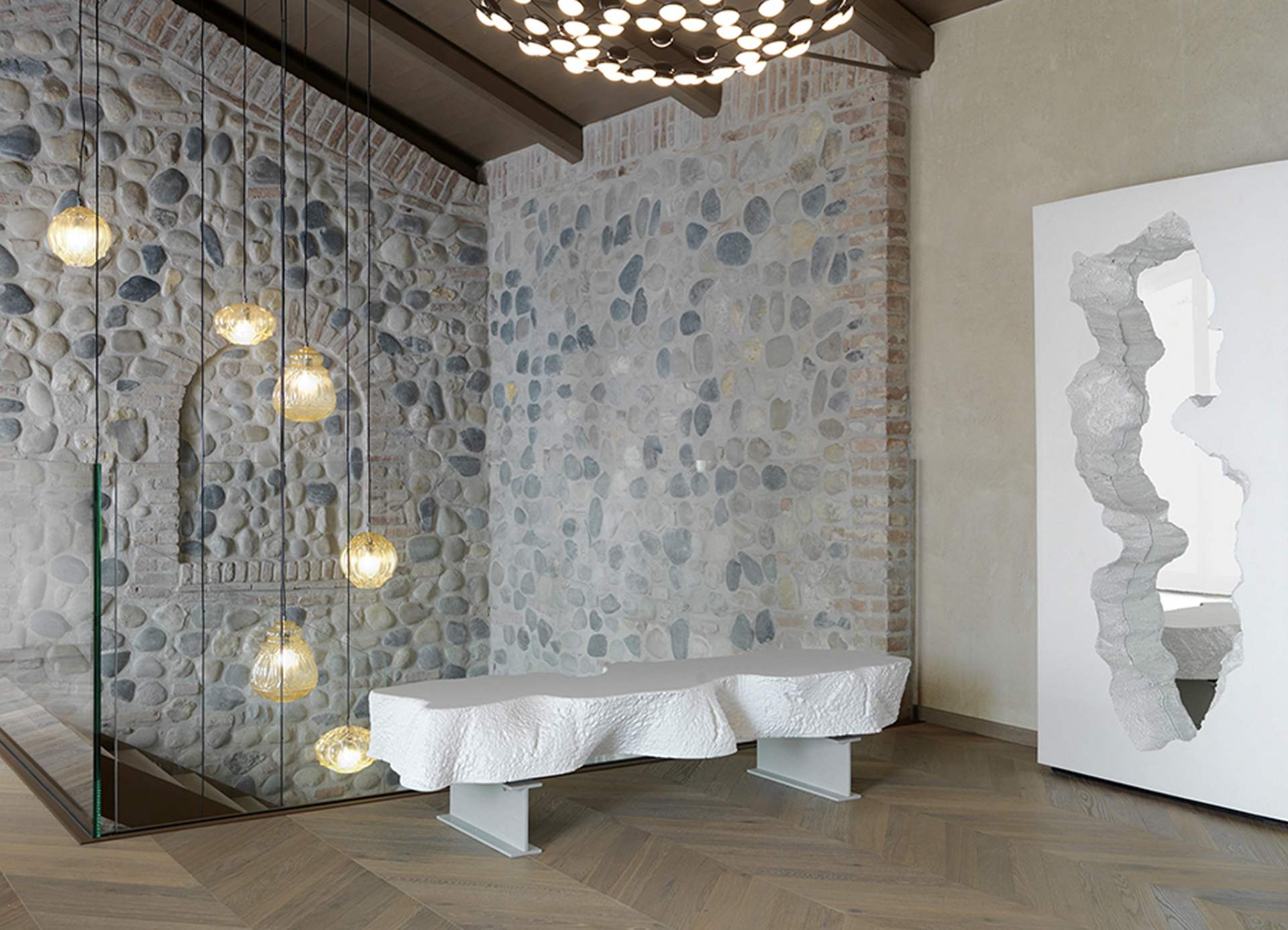 Snarkitecture Broken Bench, 2020 Irregular slab in soft polyurethane hand finished with Guflac®, supported by beams in a highly resistant plastic agglomerate. L190 x W70 x H43 cm