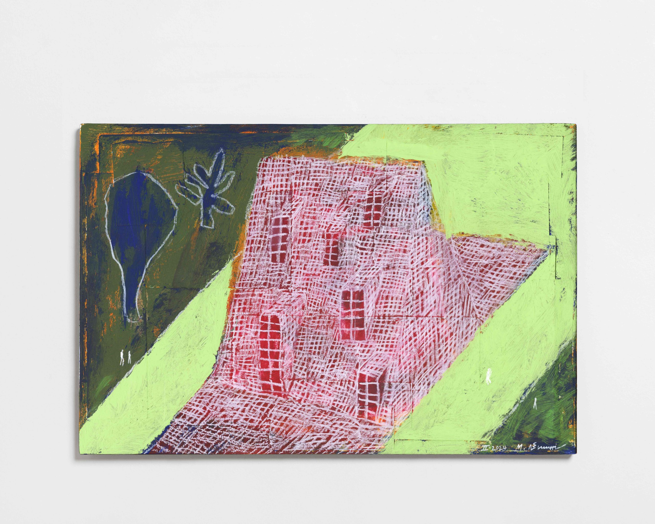 Michele De Lucchi House with dormers, 2024 Tempera, vinyl paint, white pencil and paper on wooden board. 20 x 30 cm