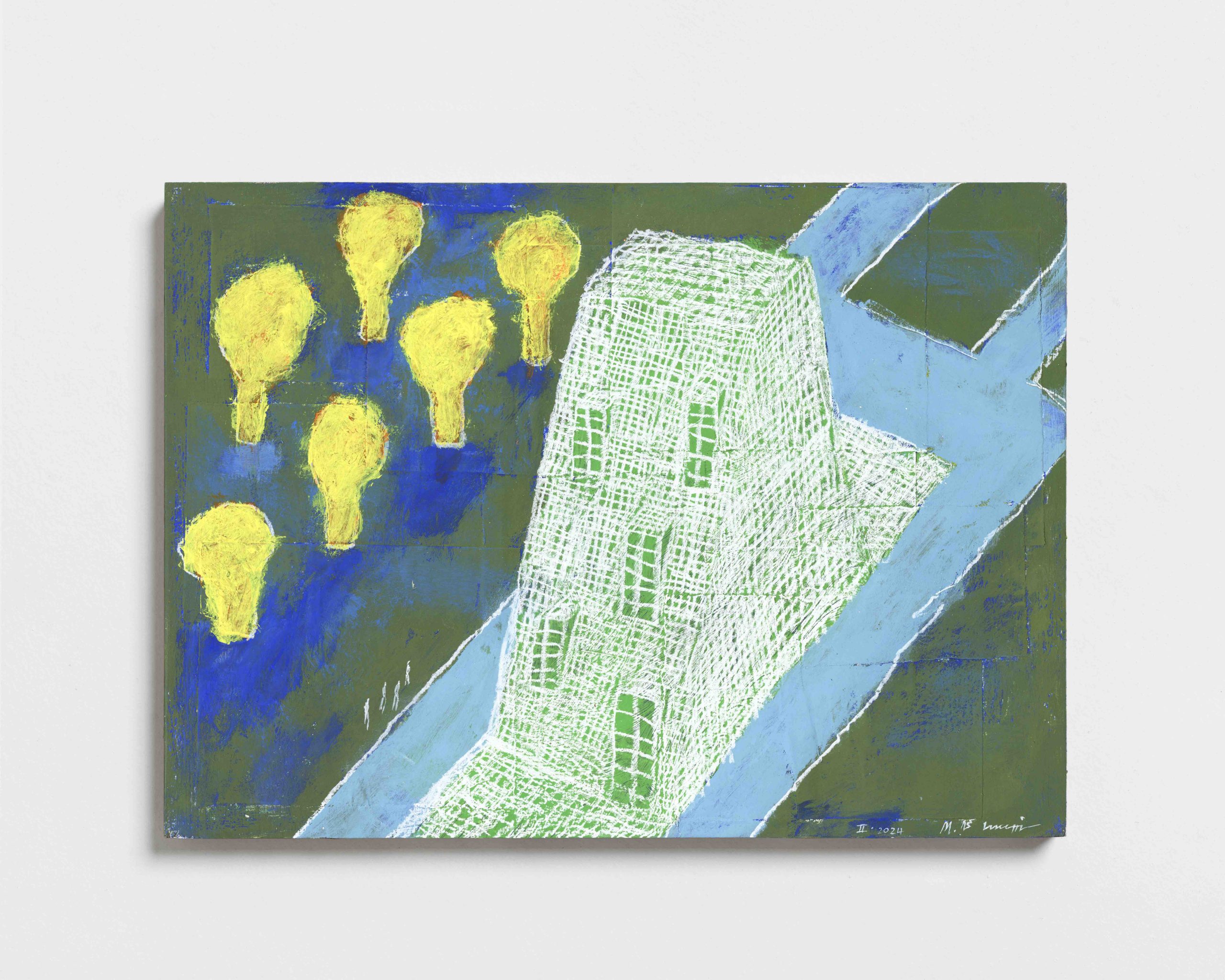 Michele De Lucchi House with dormers, 2024 Tempera, vinyl paint, white pencil and paper on wooden board. Background by Ottorino De Lucchi. 40 x 50 cm