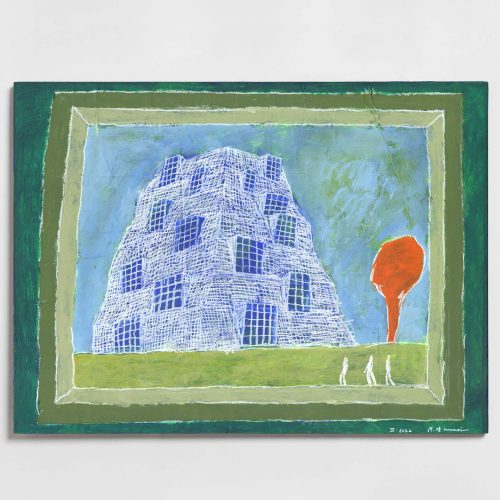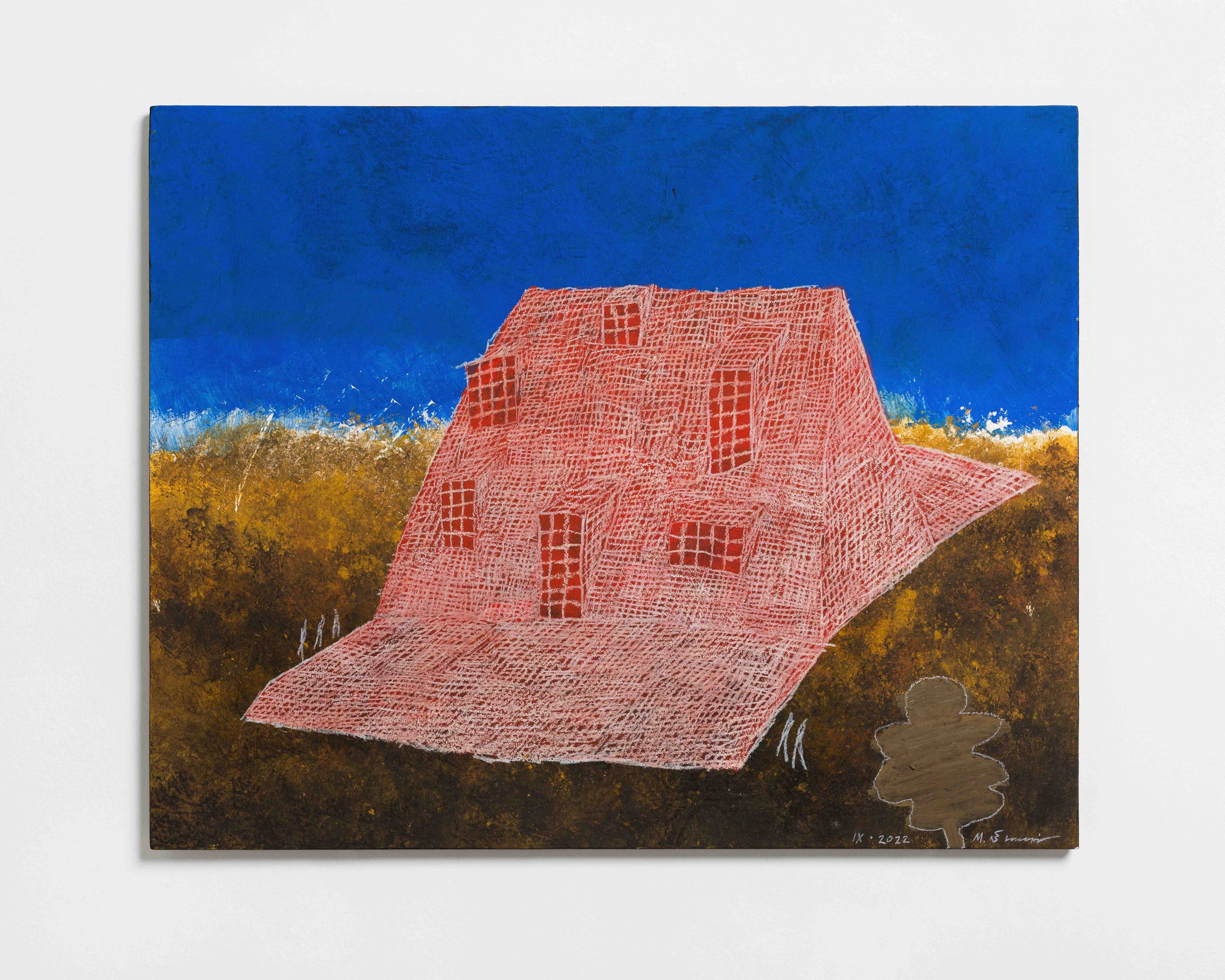 Michele De Lucchi House with dormers, 2024 Tempera, vinyl paint, white pencil and paper on wooden board. Background by Ottorino De Lucchi. 40 x 50 cm