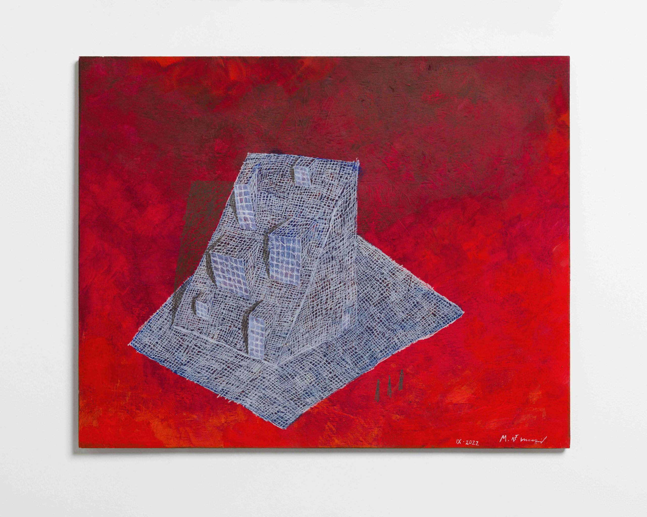 Michele De Lucchi House with dormers, 2024 Tempera, vinyl paint, white pencil and paper on wooden board. Background by Ottorino De Lucchi. 40 x 50 cm