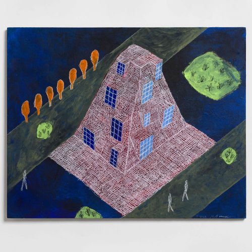 Michele De Lucchi House with dormers, 2024 Tempera, vinyl paint, white pencil and paper on wooden board. 22 x 30 cm