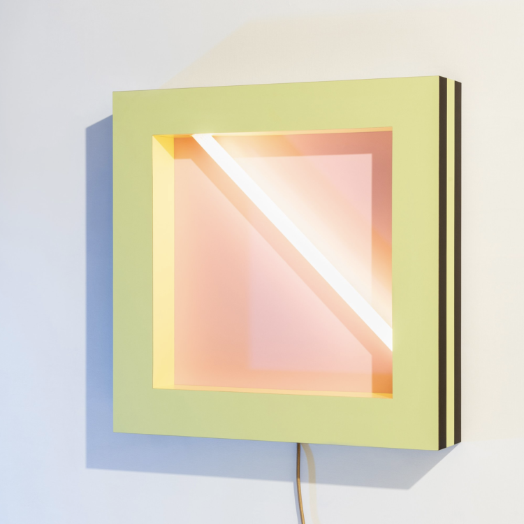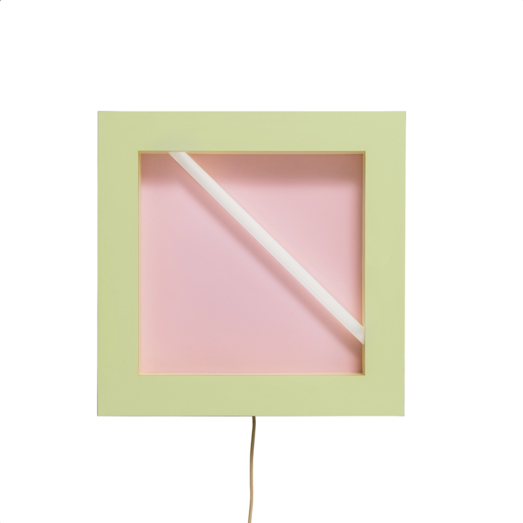 Wall lamp in wood and plastic laminate with alternating layers of colour, and with a neon light embedded within the frame.