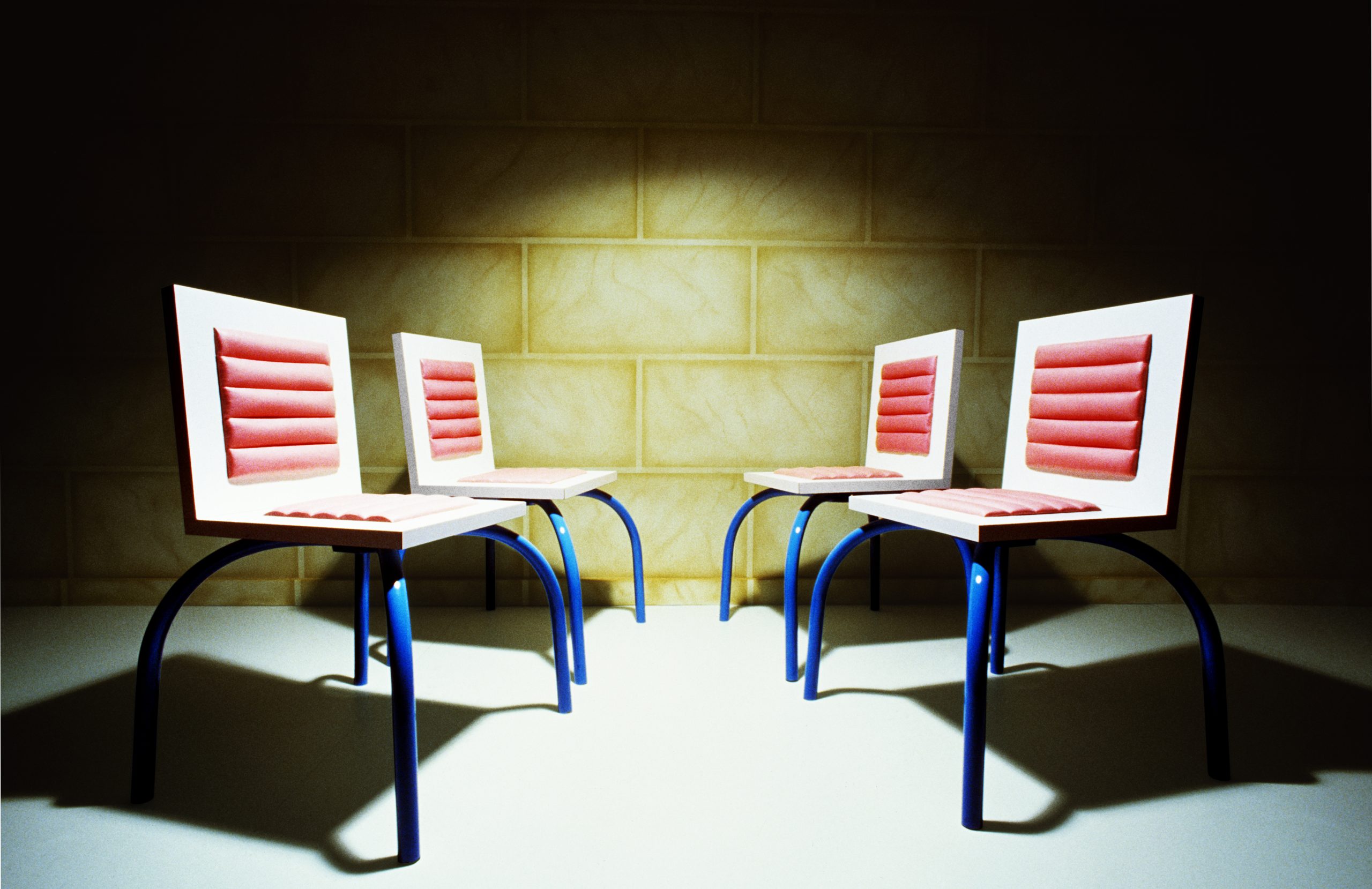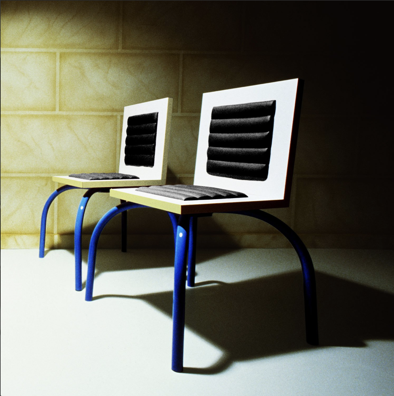 Chair in plastic laminate with cushions covered in pink or black chintz cotton